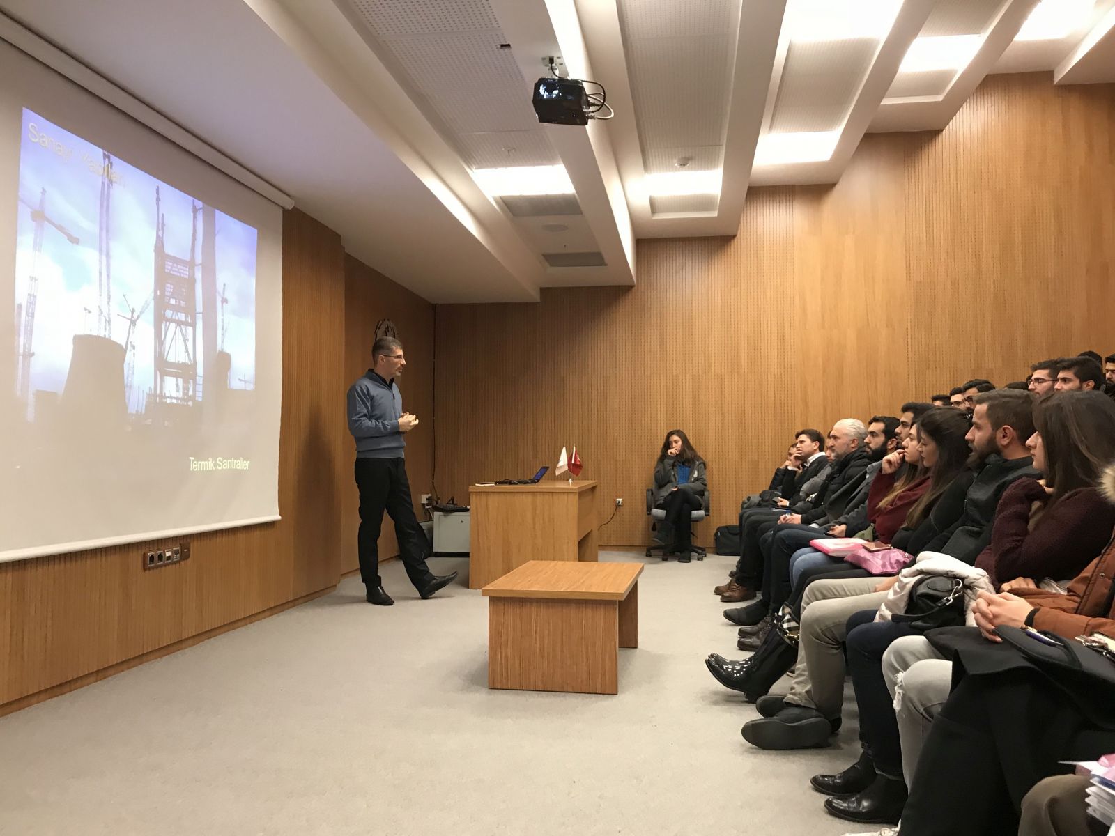 Barış Yıldız, sunumunda çelik yapıların projelendirme ve tasarım süreçlerine ait bilgiler verdi. Bu kapsamda, özellikli çelik yapılar ile yüksek binalarda çelik uygulamalarına ait detay bilgileri öğrencilerimizle paylaştı.