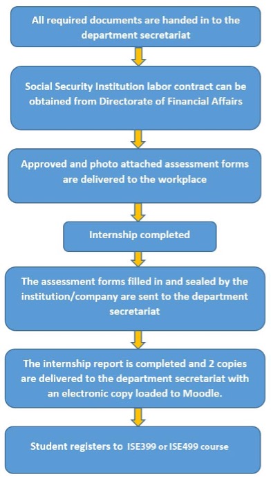 - The students who complete their internships must register for ISE 399/499 Summer Practice I/ II courses in the following Fall term. If a student cannot register for these courses in the following Fall term, s/he has to do it in the next Spring term provided that s/he hands in the report in the Fall term. Provided that the students cannot register for these courses in the Spring term following their internships either, they need to repeat their internships.
