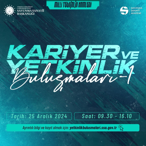 Savunma Sanayii Başkanlığı Savunma Sanayii Akademi tarafından Milli Yetkinlik Hamlesi çerçevesinde 25 Aralık Çarşamba günü ilk defa gençlerle Kariyer ve Yetkinlik Buluşmaları gerçekleştiriliyor olacak. Bu etkinlikte, savunma sanayiinden geleceğin yetkinliklerine, dijitalleşmeden teknoloji ve yapay zekâya kadar pek çok önemli konu ele alınacak. Ayrıca, olimpiyat oyunlarında başarı elde etmiş sporcularımızın ilham veren hikayelerini de dinleme fırsatı bulacaksınız. Sevgili gençler, bu ilham verici buluşmada sizleri de mutlaka aramızda görmek istiyoruz!