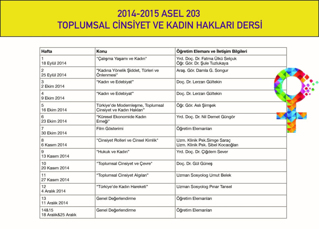 Merkezimiz tarafından 2011- 2012 akademik yılından beri her yıl güz döneminde üniversitemizin tüm lisans öğrencilerinin alabileceği Toplumsal Cinsiyet ve Kadın Hakları dersi seçmeli olarak açılmaktadır. Dersin yürütülmesinde üyelerimizden biri koordinatörlük görevini üstlenirken; tüm üyelerimiz çalışma ve uzmanlık alanları doğrultusunda dersin bir haftasını üstlenmekte; bazı haftalarda ise, üniversitemiz dışından belirlenen konular için alanında uzman konuklar derse davet edilmektedir.
