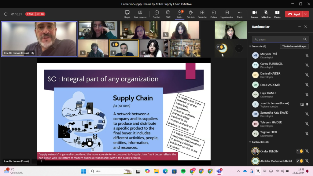 18 Aralık Çarşamba akşamı, Atılım Supply Chain Initiative öğrenci topluluğu, kıdemli bir tedarik zinciri ve lojistik yöneticisi olan Jose De Lemos'u bir webinarda ağırlama onuruna erişti. Webinarın konusu “Tedarik Zincirlerinde Kariyerler”di. Jose De Lemos, sektördeki 40 yıllık kapsamlı deneyiminden, Warner-Lambert, Pfizer ve Viatris gibi önde gelen şirketlerdeki çalışma deneyimlerinden bahsetmek üzere öğrencileri kariyerinin farklı bölümlerinde gezdirdi. Ardından, başarılı bir kariyerin anahtarlarını açıklayarak tedarik zinciri yöneticisi olmak isteyenlere tavsiyelerde bulundu. Esnek yönetim becerilerinin önemi, sektör farkındalığı ve uzun vadeli başarıyı garantilemek için her zaman bir büyüme zihniyetine sahip olmanın nasıl sağlanacağı hakkında konuştu. Weinarın sonuna doğru, çeşitli bölümlerden öğrencilerin yanı sıra bazı akademik personel de dahil olmak üzere katılımcıların birçok sorusunu yanıtladı. Sorulan soru sayısı toplantının süresini biraz artırsa da 61 canlı izleyici ve 86 kayıtlı katılımcıyla başarılı bir etkinlik gerçekleştirildi. Değerli vakti için Jose De Lemos'a ve ilgileri için öğrencilere ve Atılım Supply Chain Initiative danışmanı hocamız Dr. Öğr. Üyesi Esra Hasdemir başta olmak üzere webinara katılan tüm akademik kadromuza teşekkür ediyoruz.
