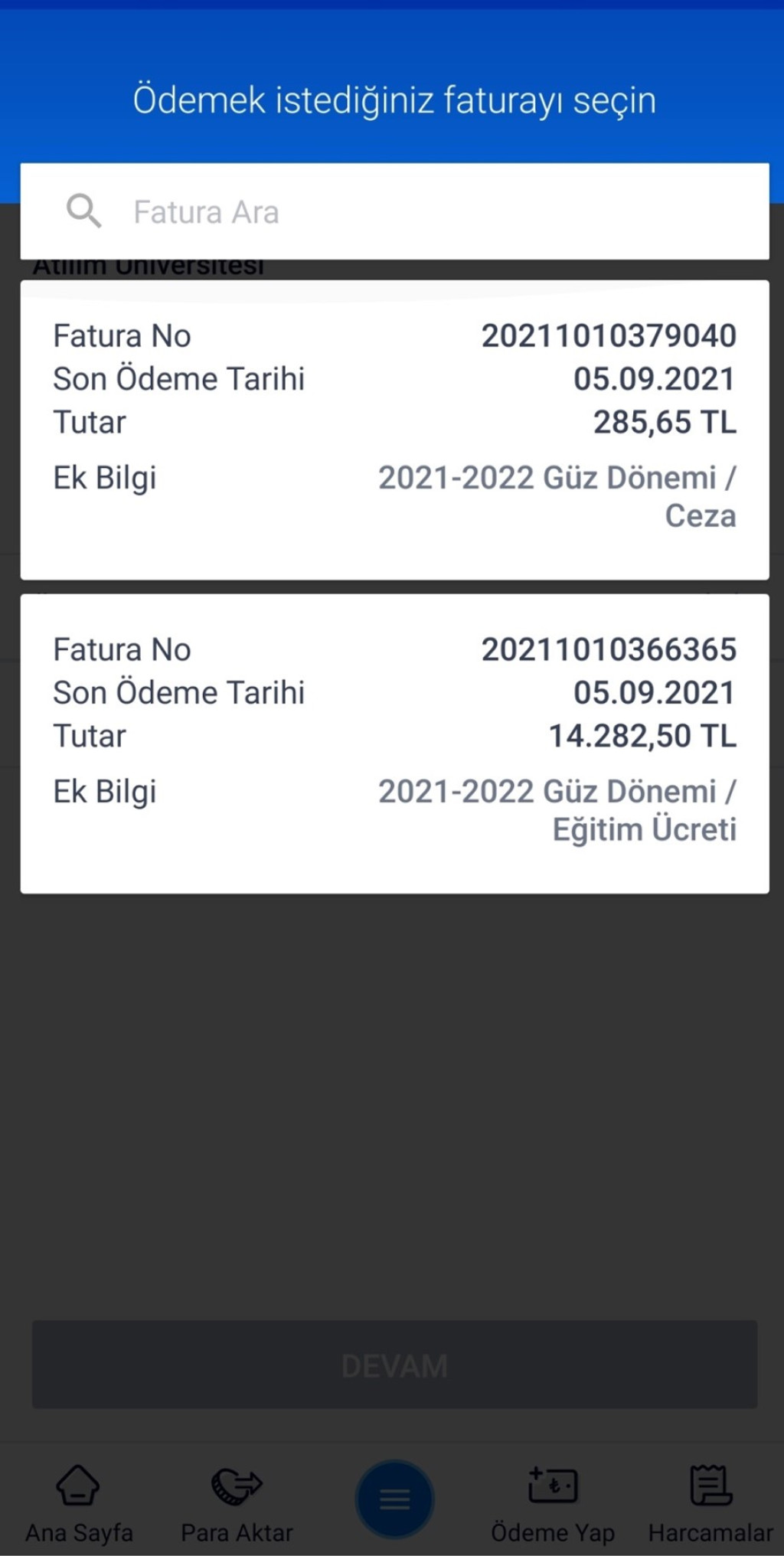- Fatura Ödeme ekranında ;