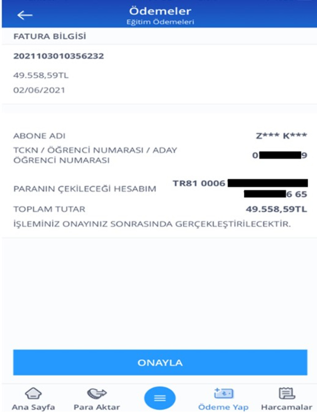 - Ödeme yapılacak hesap seçilir ve ödeme işlemine devam edilir. Ödeme ekranında onay işlemi sonrası ödeme işlemi tamamlanır.