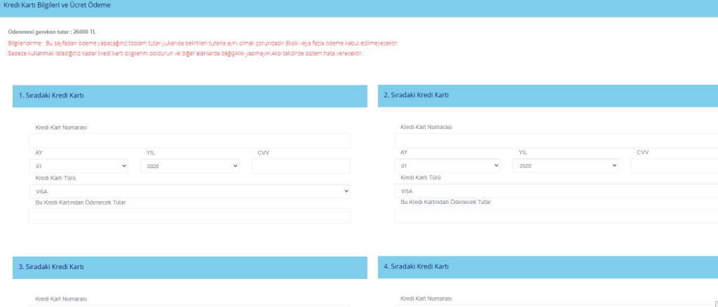 4- “Çoklu Kredi Kartı Ödeme‘’ yöntemi tercih edilmesi durumunda aynı anda en fazla 5 kredi kartı bilgisi girişi yapılarak öğretim ücreti ödemesi yapılabilmektedir. Çoklu Kredi Kartı ödemelerinde taksit işlemi yapılmamaktadır.