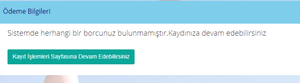 5- Ücret ödemesi yapılmış ve ödeme bilgisi sisteme yansımış olanlar aşağıdaki ekran görüntüsü ile karşılaşacaklar ve kayıt işlemlerine devam edebileceklerdir.