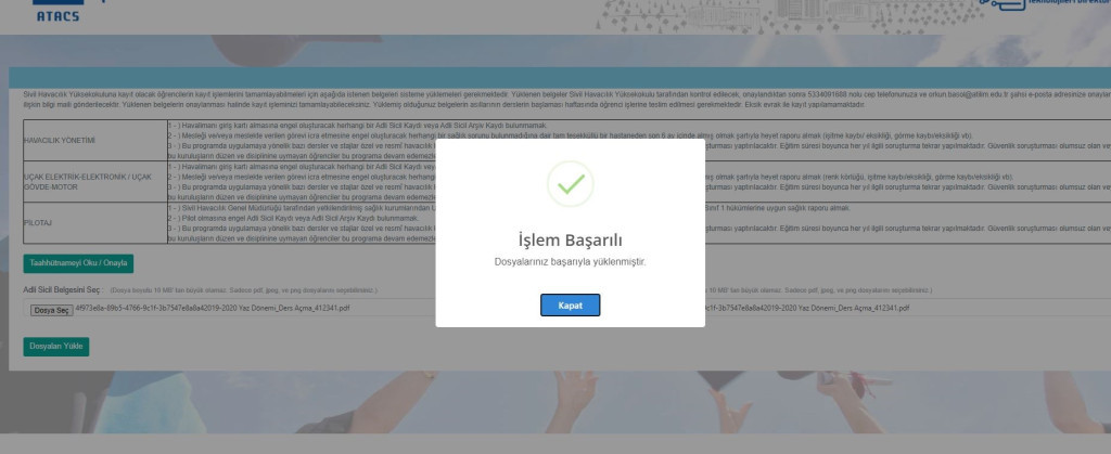 Sadece Sivil Havacılık Yüksekokuluna kayıt olacak öğrencilerin e-devlet üzerinden alınmış Adli Sicil Belgelerini e-kayıt sistemine yüklemeleri gerekmektedir.