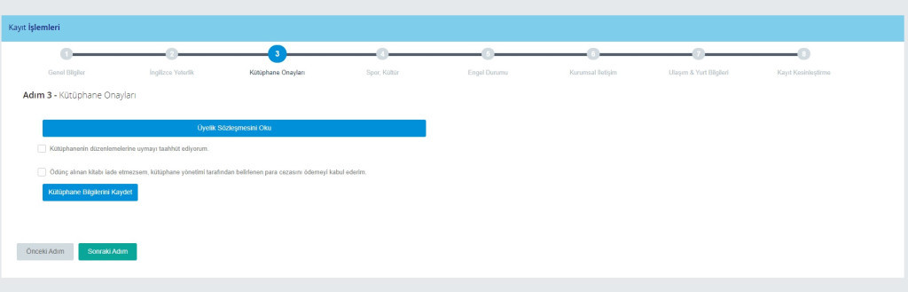 Burada bulunan üyelik sözleşmesi okunduktan sonra “Kütüphane düzenlemelerine uymayı kabul ediyorum” ve "Ödünç alınan kitabı iade etmezsem, kütüphane yönetimi tarafından belirlenen para cezasını ödemeyi kabul ederim” seçeneklerini (zorunlu) işaretleyiniz ve “Kütüphane Bilgilerini Kaydet” butonuna basarak kütüphane kayıt işlemini tamamlayınız.