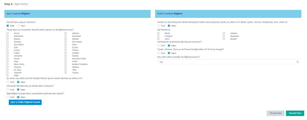 Bu alanda ilgi duyduğunuz kültür ve spor faaliyetlerine ilişkin bilgileri seçmeniz gerekmektedir.
