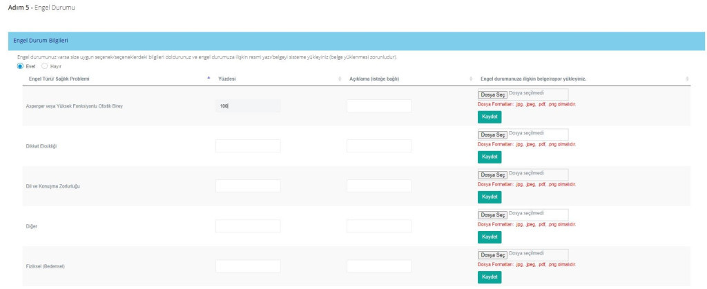 Not: Engel durumuna ilişkin belgenin yüklenmesi zorunludur. Engel durumuna ilişkin bir belgeniz mevcut değilse "Engel Durumu" bilgisini boş bırakınız. Durumunuz ile ilgili bilgiyi kayıtlar sonrasında Özel Gereksinimli Bireyler Destek Birimi yetkililerine iletebilirsiniz.