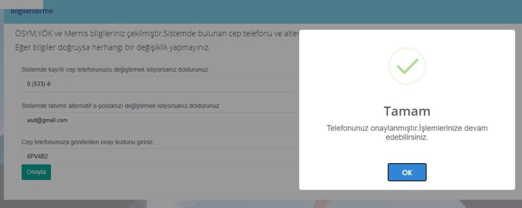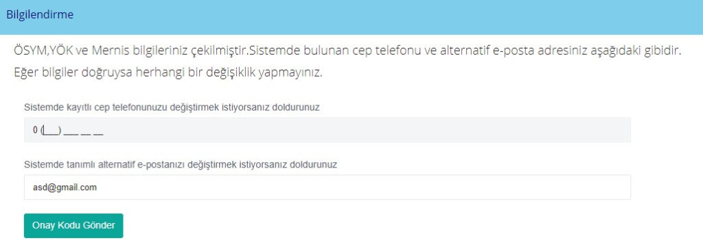 Burada vermiş olduğunuz numara ve e-posta adresine kayıt sırasında bilgilendirme mesajları atılacaktır.