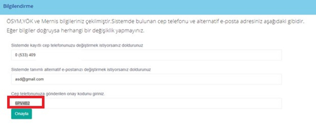 “Onay Kodu Gönder” butonuna basıldığında cep telefonunuza gelecek doğrulama kodunu aşağıda bulunan alana girip doğrulama işlemini tamamlayınız.