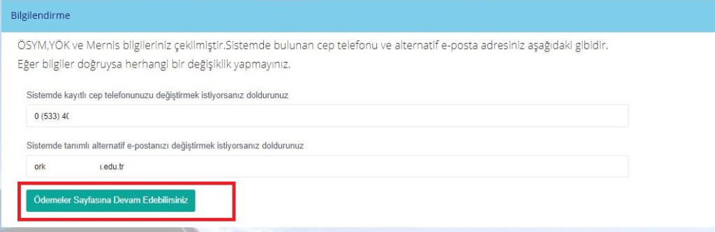 Doğrulama işlemini tamamlandıktan sonra, “Ödemeler Sayfasına Devam Edebilirsiniz” butonuna basarak kayıt işleminize devam ediniz.