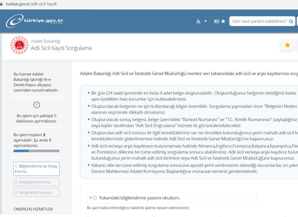 Adli sicil kaydı belgesi almak için https://www.turkiye.gov.tr/adli-sicil-kaydi adresine giriş yaptıktan sonra aşağıdaki işlemleri yapınız.