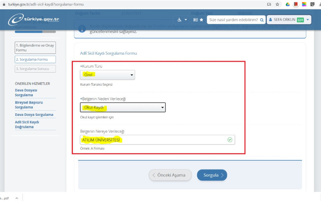 “Kurum türü”: Özel," “Belgenin neden verileceği”: “Okul Kaydı” olarak seçilir. Belgenin nereye verileceği: “ATILIM ÜNİVERSİTESİ” yazılarak "Sorgula" butonuna basılır.