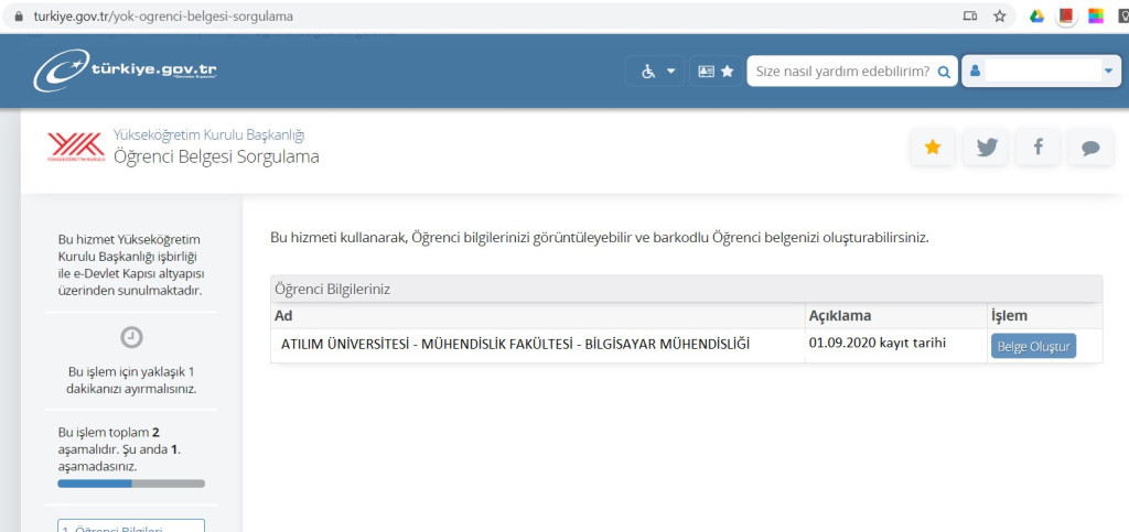 Öğrenci belgesi almak için https://www.turkiye.gov.tr/yok-ogrenci-belgesi-sorgulama adresine giriş yaptıktan sonra aşağıdaki işlemleri yapınız.