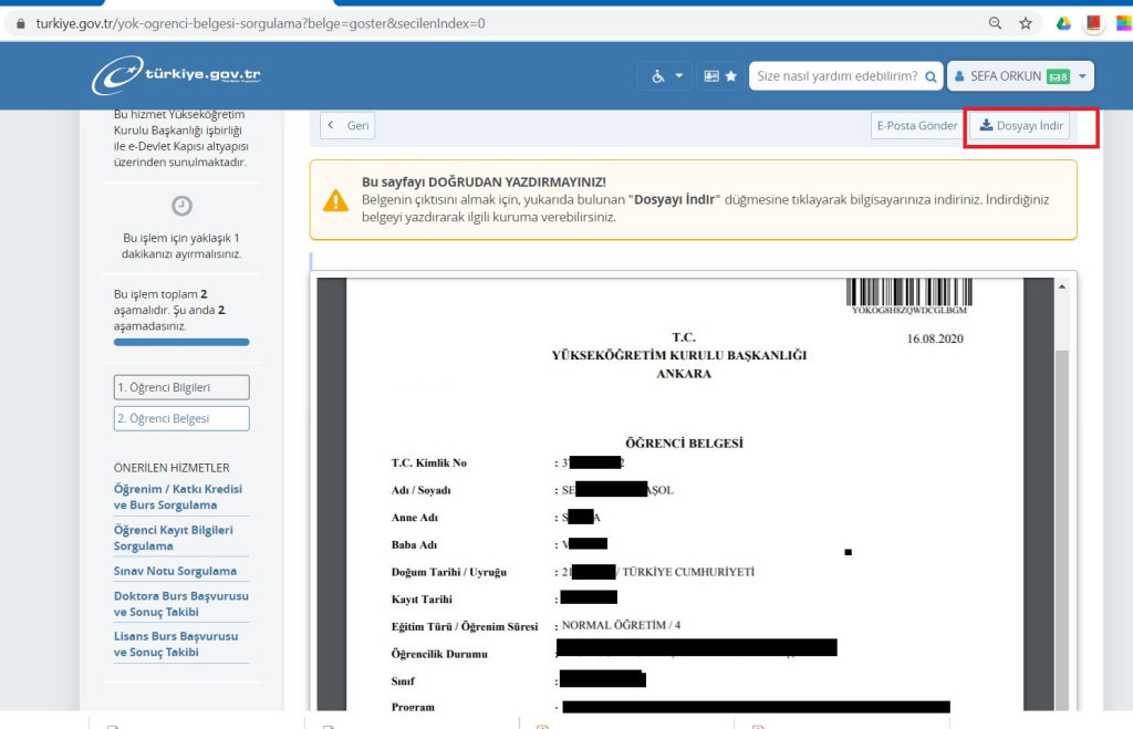 Kayıt olan öğrenciler isterlerse iki gün sonrasında https://www.turkiye.gov.tr/yok-ogrenci-belgesi-sorgulama üzerinden öğrenci belgelerinin dökümünü de alabileceklerdir.