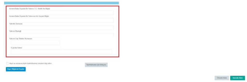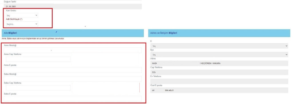 Aile bilgilerine ilişkin anne, baba veya belirtilecek diğer bir yakından en az birine ait bilgilerin doldurulması gerekmektedir.