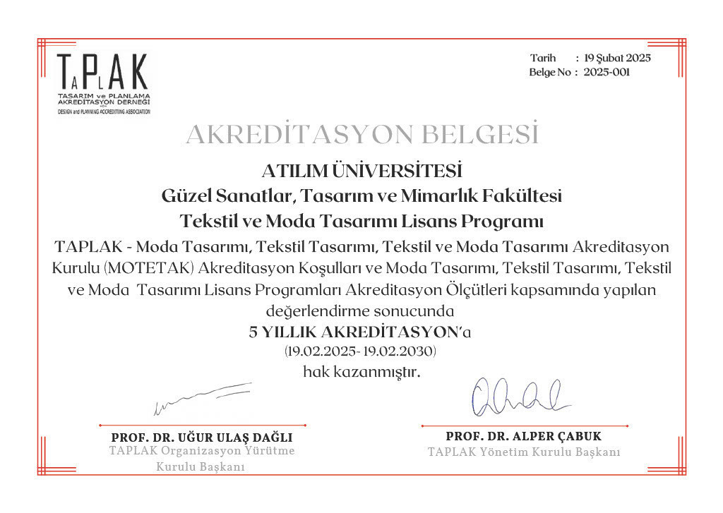 TAPLAK - Moda Tasarımı, Tekstil Tasarımı, Tekstil ve Moda Tasarımı Akreditasyon Kurulu'nun (MOTETAK) 19 Şubat 2025 tarihli kararı ile Tekstil ve Moda Tasarımı Lisans Programımız, Akreditasyon Ölçütleri kapsamında 19.02.2025 - 19 02.2030 tarihlerini kapsayan 5 yıllık akreditasyon'a hak kazanmıştır.