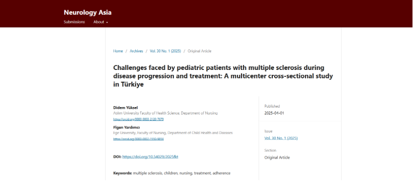 Dr. Öğr. Üyesi Didem YÜKSEL’in “Multipl Sklerozlu Pediatrik Hastaların Hastalık İlerlemesi ve Tedavisi Sırasında Karşılaştıkları Zorluklar: Türkiye'de Çok Merkezli Kesitsel Bir Çalışma” başlıklı makalesi, Journal of Neurology Asia dergisinde yayımlanmak üzere kabul edilmiştir. Bu değerli çalışma, ilgili alandaki literatüre yeni bir bakış açısı kazandırmayı amaçlamaktadır.