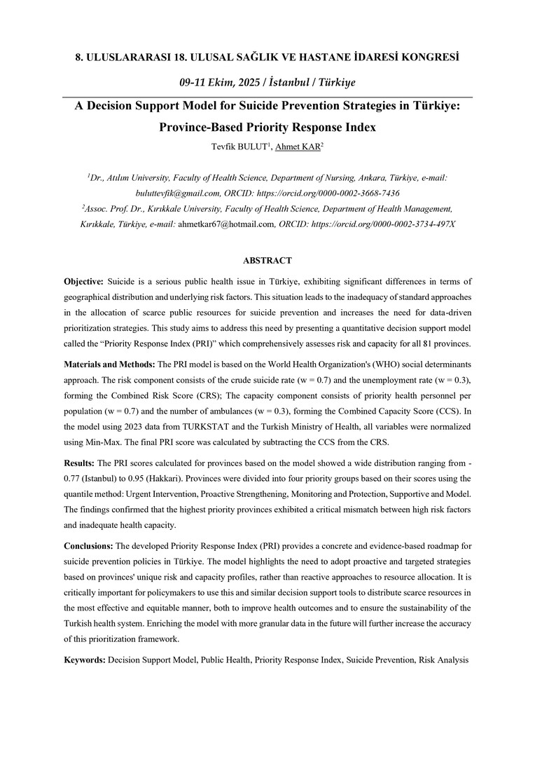 9–11 Ekim 2025 tarihlerinde İstanbul’da gerçekleştirilen 8. Uluslararası ve 18. Ulusal Sağlık ve Hastane İdaresi Kongresi kapsamında, bölümümüz öğretim üyesi Dr. Tevfik Bulut, “A Decision Support Model for Suicide Prevention Strategies in Türkiye: Province-Based Priority Response Index” başlıklı çalışmasını sunmuştur.