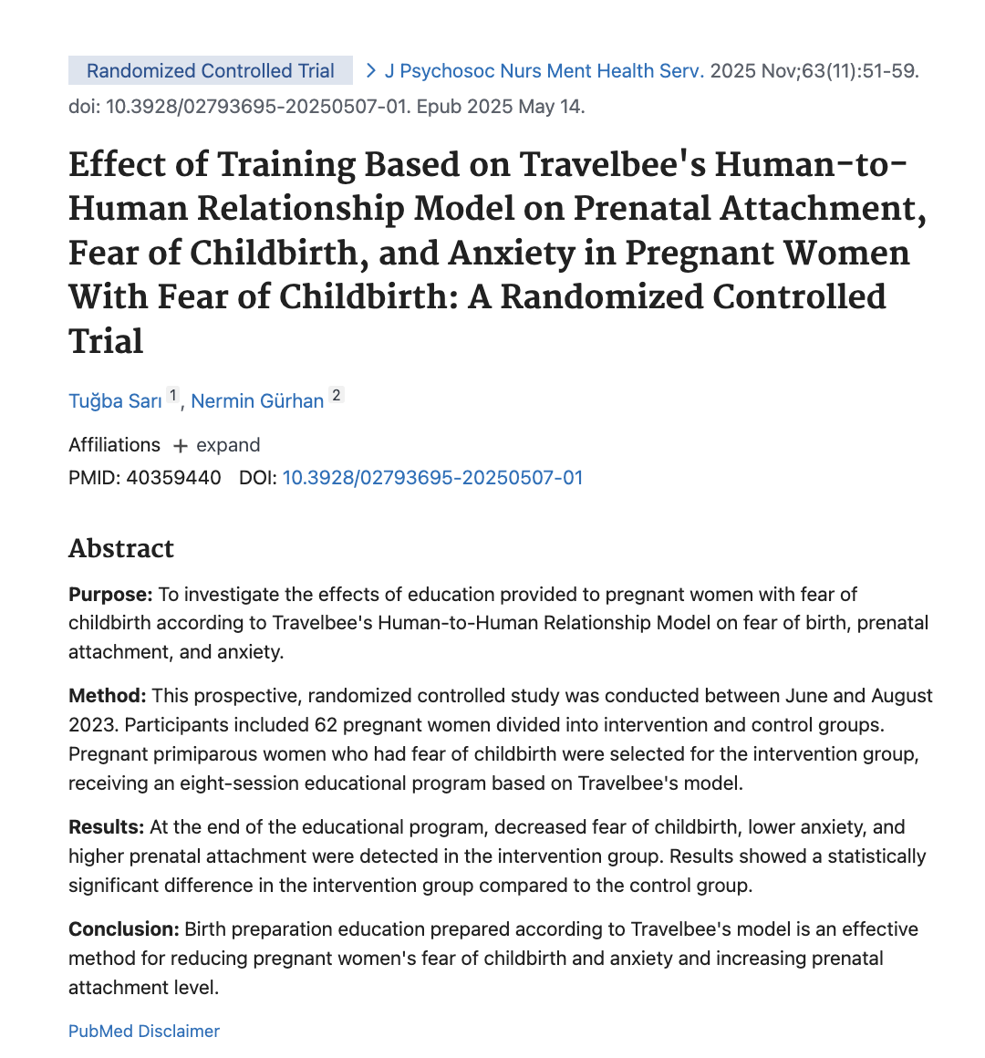 Atılım Üniversitesi Sağlık Bilimleri Fakültesi öğretim üyesi Dr. Öğr. Üyesi Tuğba Sarı'nın, "Effect of Training Based on Travelbee’s Human-to-Human Relationship Model on Prenatal Attachment, Fear of Childbirth, and Anxiety in Pregnant Women With Fear of Childbirth: A Randomized Controlled Trial" başlıklı makalesi, Journal of Psychosocial Nursing and Mental Health Services de yayımlandı. Dergi, Web of Science veritabanında indekslenmektedir.