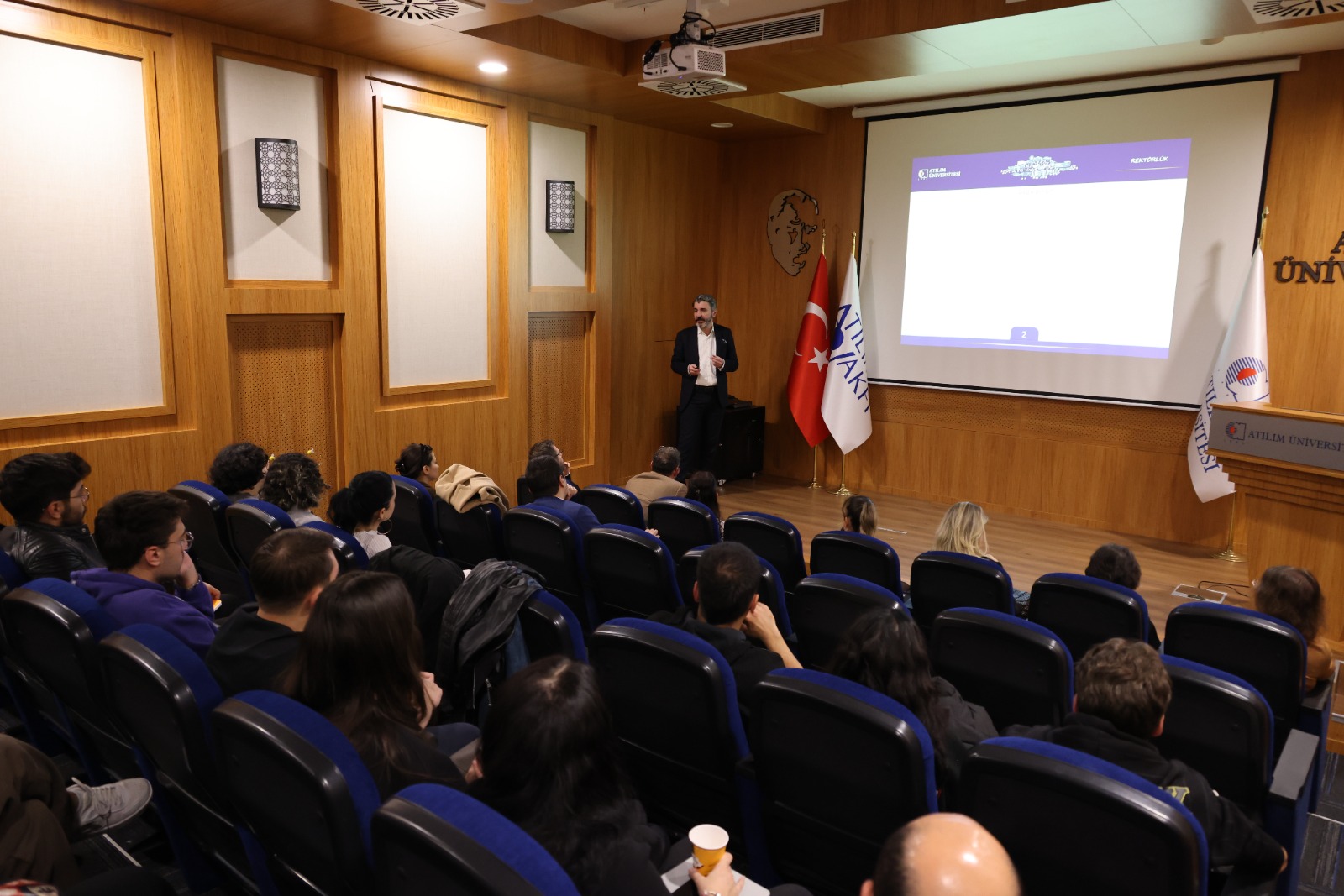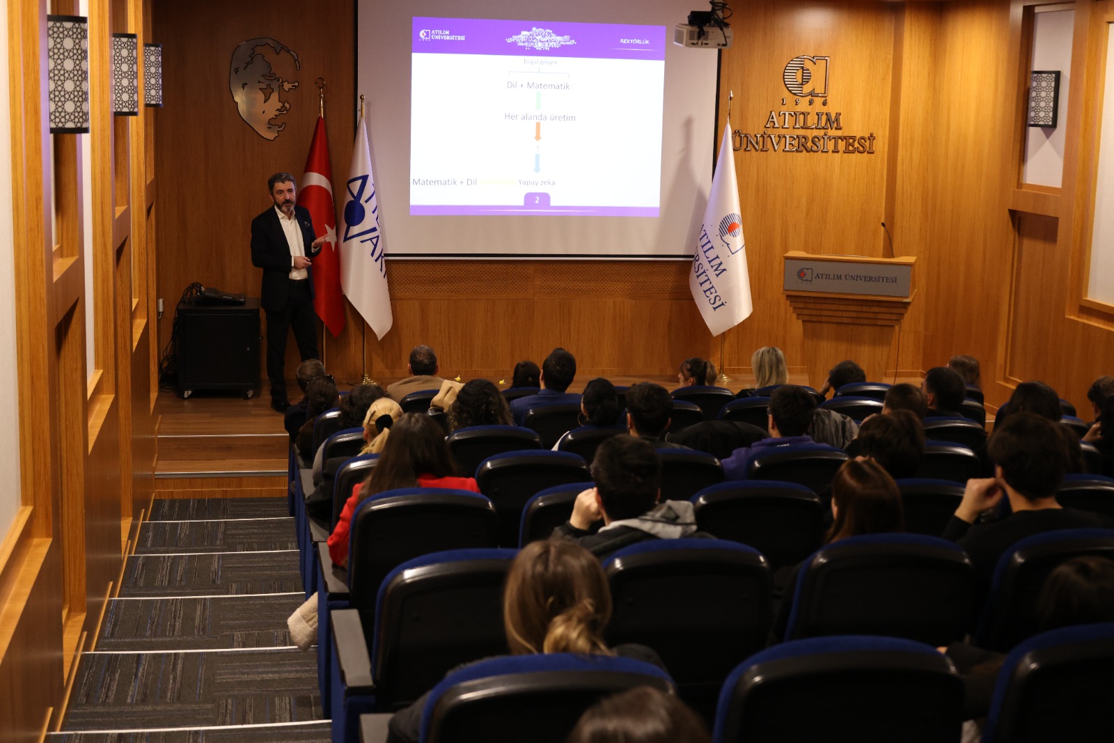 27 Kasım 2025 tarihinde Atılım Üniversitesi Rektörü Prof. Dr. Serkan Eryılmaz, Rektör Fakültede ve ATU100 Üniversite Hayatına Giriş Dersi programları kapsamında, İşletme Fakültesi ve Fen - Edebiyat Fakültesi öğrencileriyle bir araya geldi. “Dil ve Matematik: İki Önemli Güç” başlıklı söyleşide, Prof. Dr. Eryılmaz hem matematiğin hem de dilin insan yaşamındaki belirleyici rolünü örneklerle anlattı.