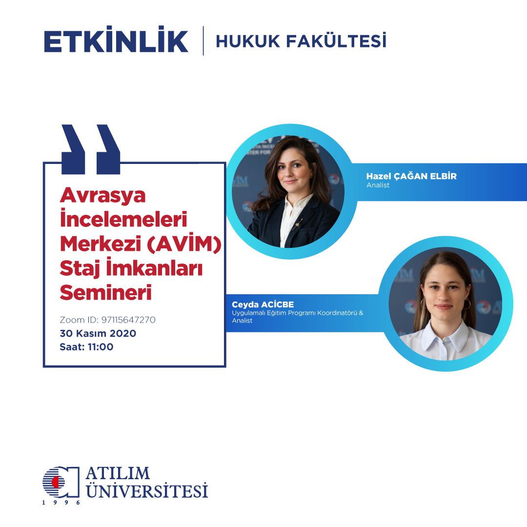 30 Kasım 2020 Pazartesi günü saat 11.00’de Zoom Programı üzerinden 97115647270 ID numarası ile Avrasya İncelemeleri Merkezi (AVİM) Staj İmkanları Semineri düzenlenecektir.