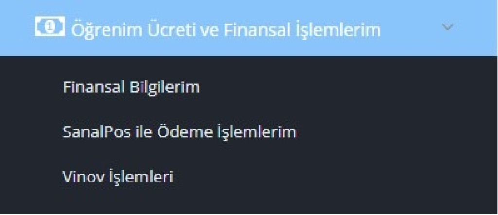 3. Öğretim Ücreti & Finansal İşlemlerim menüsünden "Vinov İşlemleri" seçilir