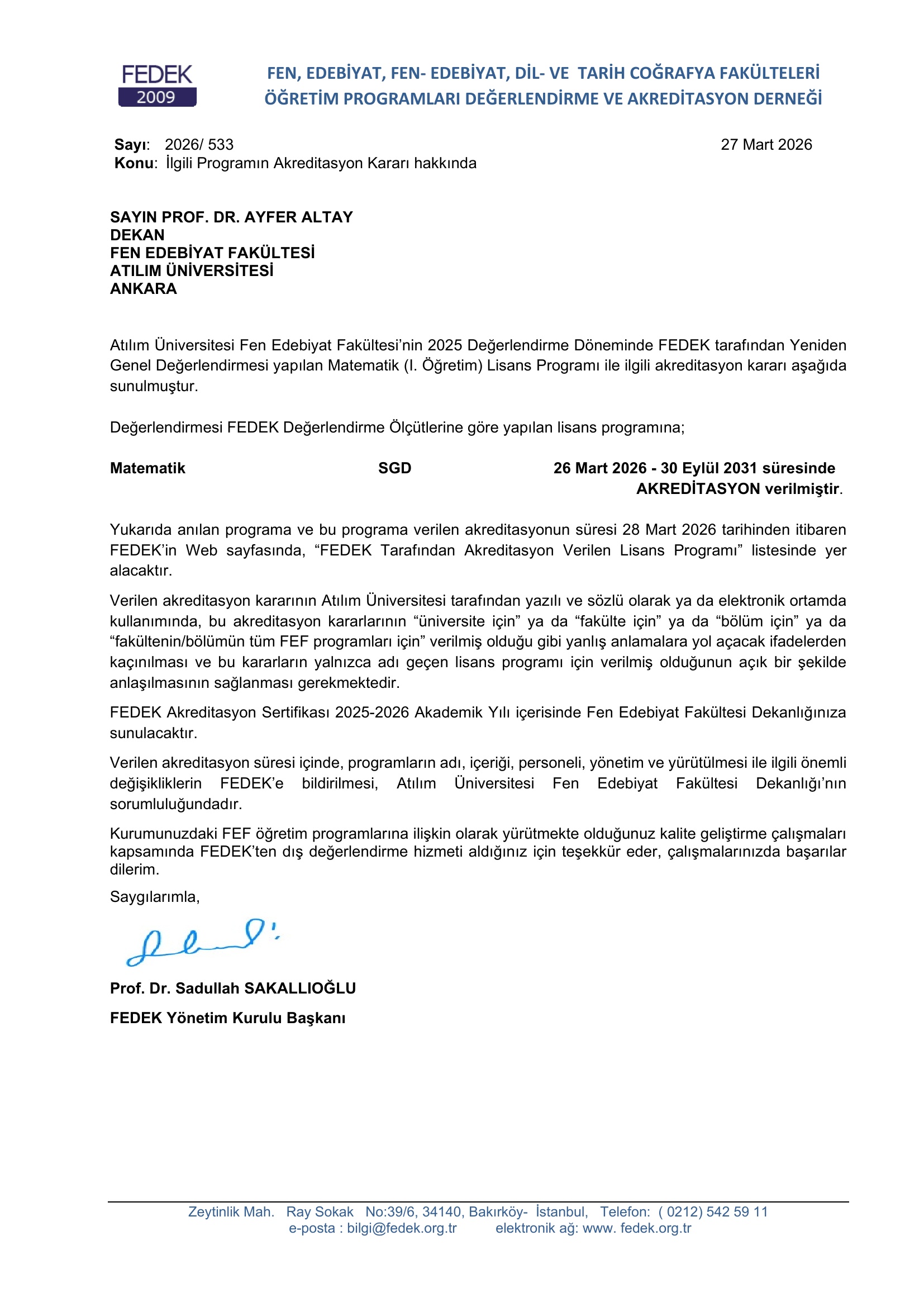 Yüksek Öğretim Kurulu tarafından ulusal bir kalite güvence kuruluşu olarak tanınan FEDEK (Fen, Edebiyat, Fen-Edebiyat, Dil ve Tarih Coğrafya Fakülteleri Öğretim Programları Değerlendirme ve Akreditasyon Derneği), 2025-2026 değerlendirme döneminde yaptığı genel değerlendirme sonucunda Matematik Bölümümüzün Lisans Programını 26 Mart 2026 tarihinden itibaren 5 yıl süreli akredite etmiştir.